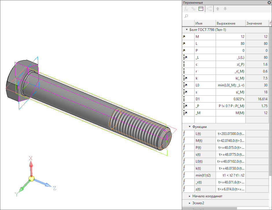 Болт по ГОСТ 7798. Параметризация завязана на диаметр и шаг резьбы, требуемую длину болта (действительная выбирается как ближайшая большая из стандартного ряда). Если шаг выбран как "0", используется крупный.