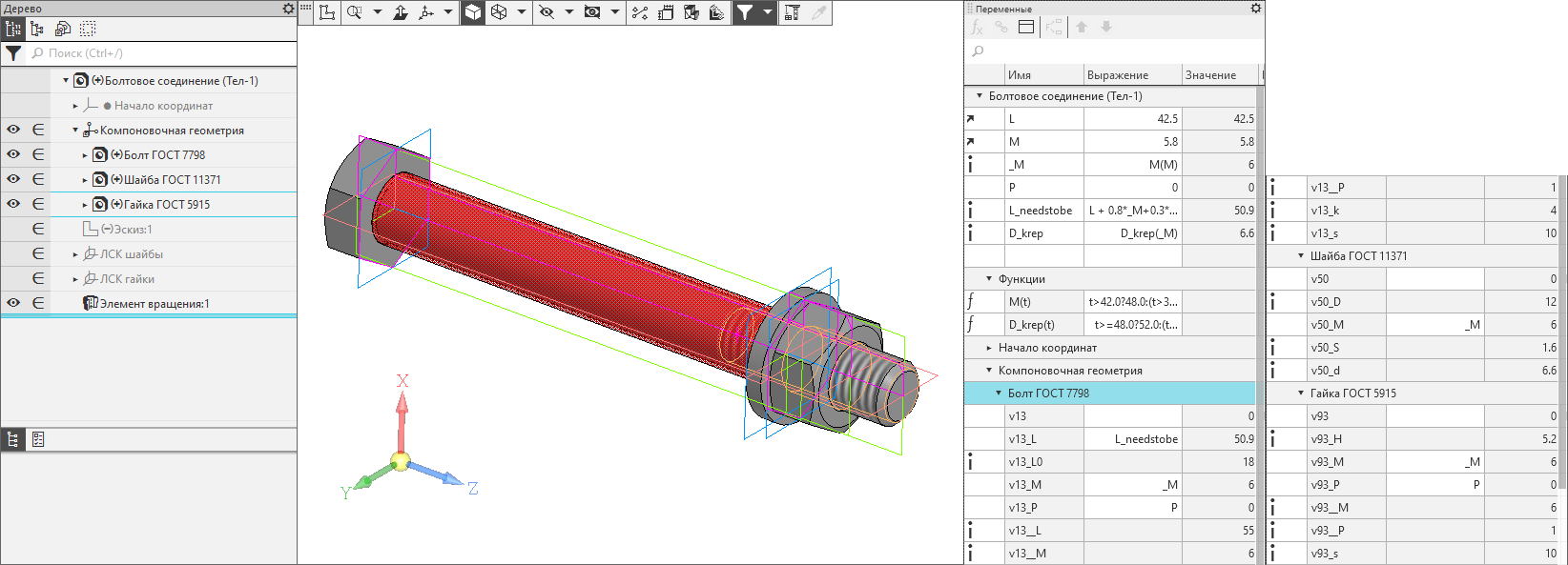Болтовое соединение как модель с болтом, шайбой, гайкой, а также с цилиндром отверстия с зазором по ГОСТ 11284 для вычитания булевой операцией. Параметризация завязана на толщину скрепляемых деталей и диаметр резьбы; шаг крупный. Длина болта рассчитывается еще и в зависимости от толщины шайбы и гайки и выбирается как ближайшая большая из стандартного ряда.