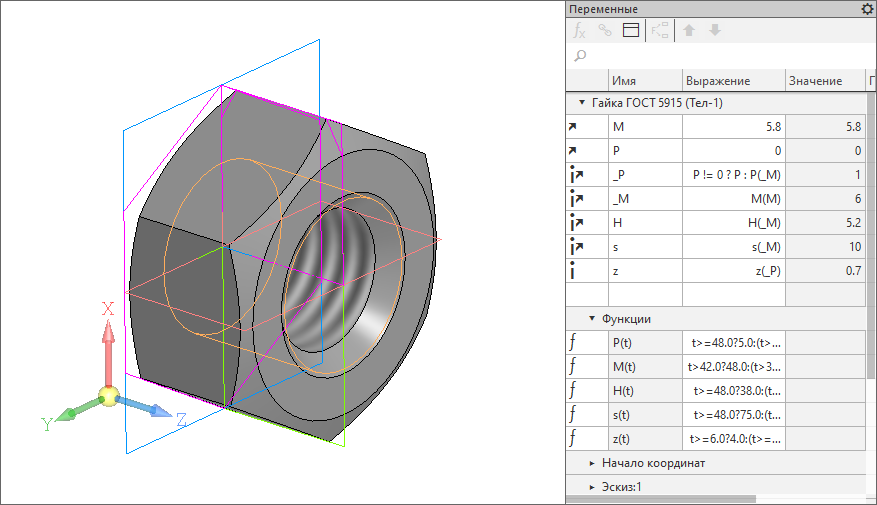 Гайка по ГОСТ 5915. Параметризация завязана на диаметр резьбы и шаг (если "0" - то крупный).