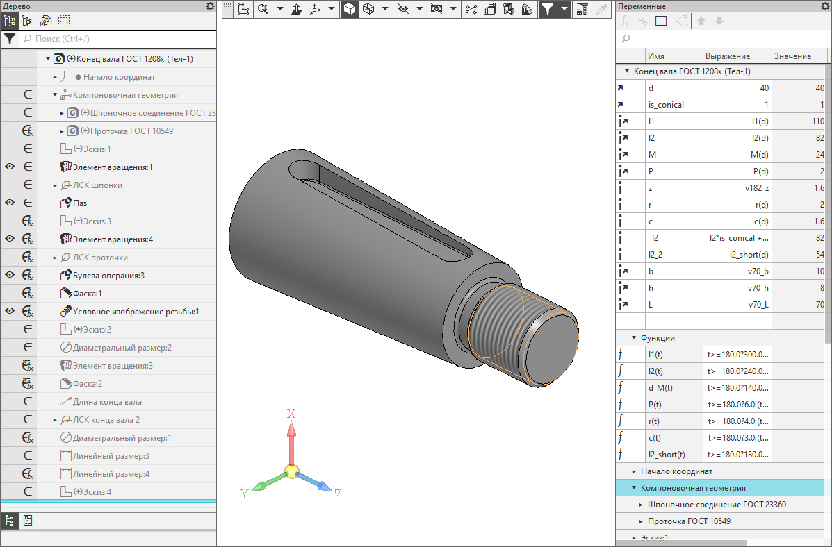 Конец вала по ГОСТ 12080/12081 длинного исполнения. Параметризация завязана на диаметр вала и флаг "конический/цилиндрический".