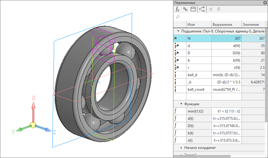 Подшипник по ГОСТ 8338 типоразмеров 204...215, 304...315. Независимой переменной является число, обозначающее типоразмер; от него зависят все размеры.