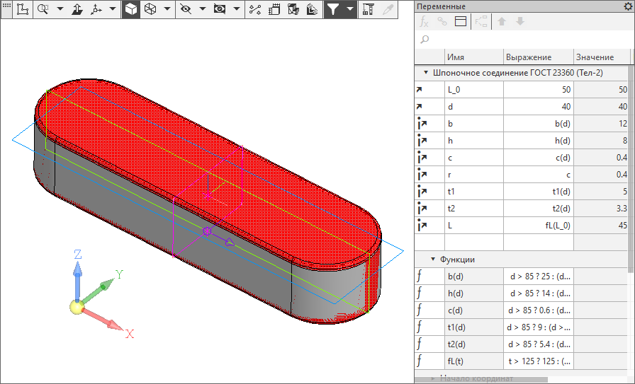Шпонка по ГОСТ 23360. Тело серого цвета - непосредственно шпонка; тело красного цвета - шпоночный паз, который можно вычесть булевой операцией. Параметризация завязана на диаметр вала и требуемую длину шпонки (действительная длина шпонки выбирается как ближайшая из стандартного ряда).